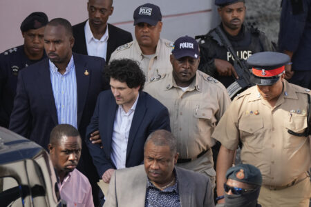 FTX founder Sam Bankman-Fried, center left, is escorted out of Magistrate Court following a hearing in Nassau, Bahamas, Dec. 19, 2022. Bankman-Fried, charged with a host…