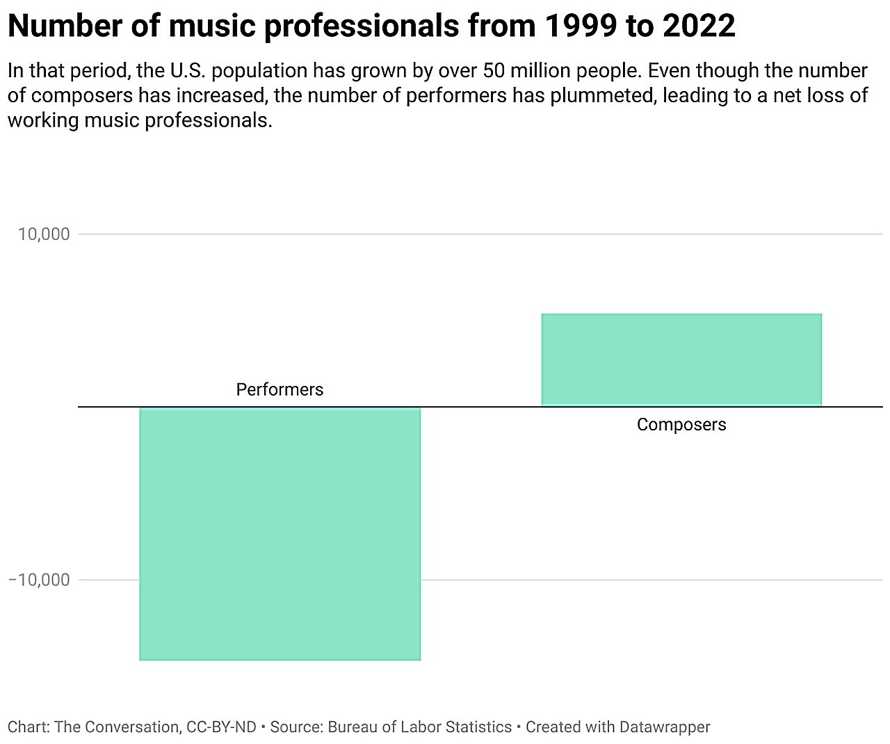 While more people have earned a living from composing music since 1999, their wage gains paled in comparison to that of performers. In short, there are fewer people working as performers now, but those who can cut it are making more money.
