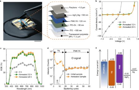 Structure, characteristics, and mechanism analysis of waterproof OPVs. a Photograph of the ultraflexible and waterproof OPVs floating on water. Schematic device structure of the waterproof OPVs.…