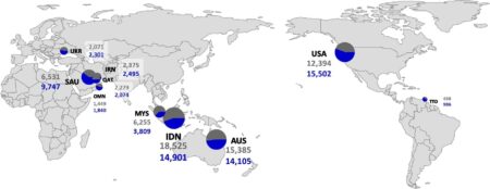 Optimization results for importing ammonia from the top ten exporting countries (Scenario 3); The circle size represents the amount of imported ammonia and the color represents…