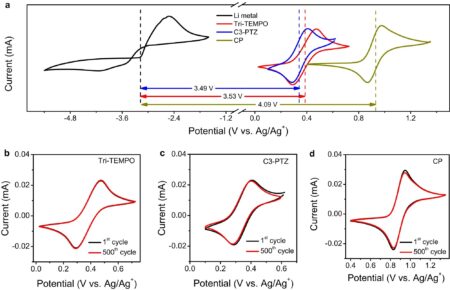 Electrochemical characterization of redox-active materials. a Cyclic voltammograms of Li metal in BMP-TFSI/LiTFSI (0.1 M) (with a Li-metal working electrode, a platinum counter electrode and Ag/Ag+ a…