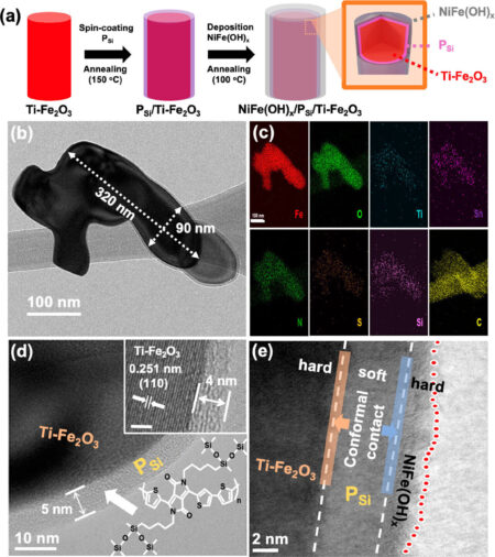 (a) Scheme for the fabrication of NiFe(OH)x/PSi/Ti–Fe2O3. (b) Transmission electron microscopy (TEM) image of NiFe(OH)x/PSi/Ti–Fe2O3 and (c) corresponding elemental mapping of Fe, O, Ti, Sn, N,…