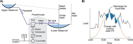 A) Hardware configuration for micro-PHES B) Example charge-discharge operation for micro-PHES adapted Morabito and Hendrick noting that solar generation capacity (kW), storage capacity (kW, kWh) and…
