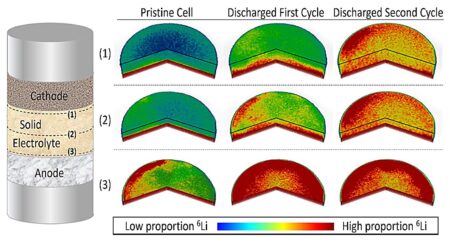 Left: schematic illustration of the solid state battery. Right: 3D representations showing the inhomogeneity of the percentage abundance of the 6Li isotope. Credit: HZB Lithium-based solid-state…