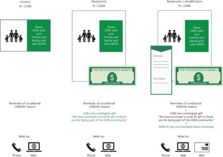 Illustration of experimental conditions. Clients of the non-profit were randomized to receive one of three mailers about the referral reward program. All mailers reminded clients that…