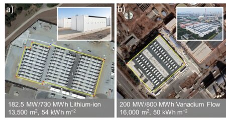 Satellite images and photos of some of the largest lithium-ion and vanadium flow batteries deployed to date. Credit: Energy Advances (2023). DOI: 10.1039/D3YA00208J Because the sun…