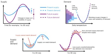 Conceptual illustrations of climate change impacts on supply, demand and SDM of wind and solar energy systems. Credit: Liu et al, Nature Energy (2023). DOI: 10.1038/s41560-023-01304-w…