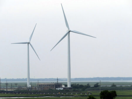 Land-based windmills in Atlantic City turn on July 20, 2023. On Aug. 4, a German wind power company and a New York utility applied for permission…