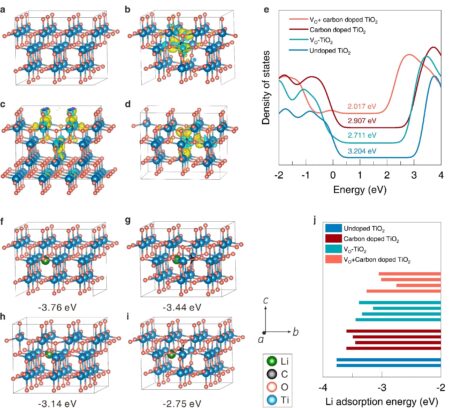(a-d) Calculated charge difference densities, (e) The total density of states plots, and (f-j) Adsorption energy comparison at the same location site of Li+ of four…