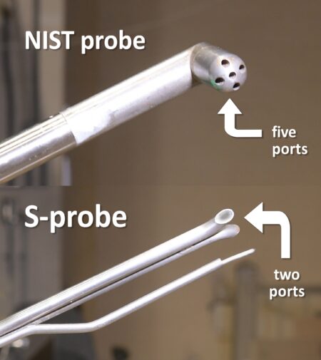The NIST pitot tube (top) has a hemispherical face with five ports used to measure gas flows in three dimensions, which gives it a better ability…