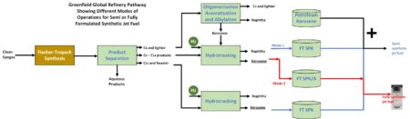 Greenfield Global refinery pathway showing different modes of operations for semi or fully formulated synthetic jet fuel. Credit: Greenfield Global/Energy Science & Engineering Greenfield Global, a…