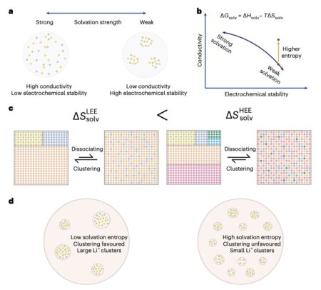 Design framework for HEEs. a, Schematic illustrating the apparent trade-off between ionic conductivity and electrochemical stability in tuning the solvation strength. Grey circles, individual clusters. b,…
