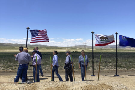 U.S. Interior Secretary Deb Haaland, center, takes part in a groundbreaking ceremony Tuesday, June 20, 2023, for the TransWest Express transmission line south of Rawlins, Wyo.…