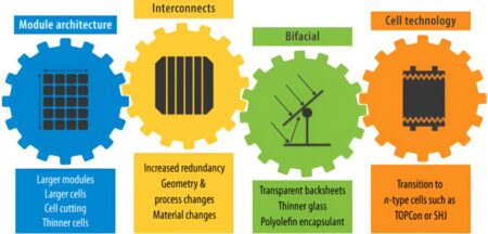 Featured on the cover of IEEE Journal of Photovoltaics, this graphic depicts four technology categories (listed across the top) and 11 key trends in a gear…