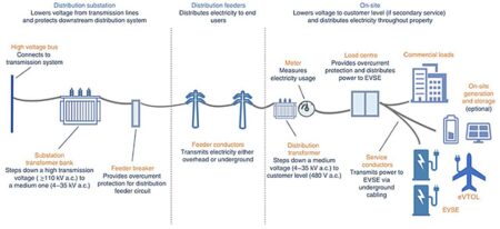Electric distribution infrastructure, shown from supply to end use, would likely require upgrades to facilitate new eVTOL charging sites. Credit: NREL Electric vertical take-off and landing…