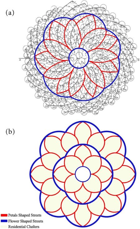 (a) Sunflower head constructed by 21 and 34 Fibonacci spirals [49]. (b) Schematic outline for the proposed sunflower pattern city model. Credit: Renewable Energy Focus (2023).…
