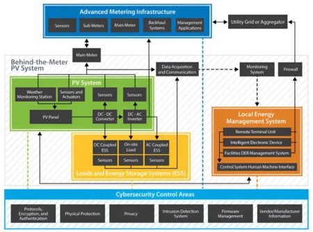 This diagram shows a detailed look at behind-the-meter solar PV system elements and their associated cybersecurity controls. Credit: 2023 IEEE PES Innovative Smart Grid Technologies Latin…