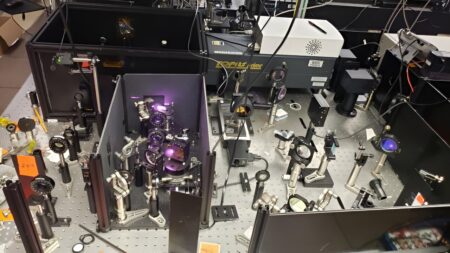A laser apparatus built by SLAC lead scientist Matthias C. Hoffmann for experiments that shook ions traveling through a solid-state battery electrolyte with a jolt of voltage.…