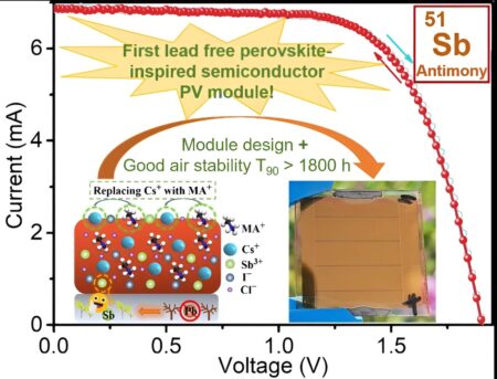 Current density−voltage (J−V) curves for the MA1.5Cs1.5Sb2I3Cl6 module (active area: 3 × 0.84 cm2), measured under standard test conditions (AM1.5G, 1,000 W/m2). Insets are schematic of…