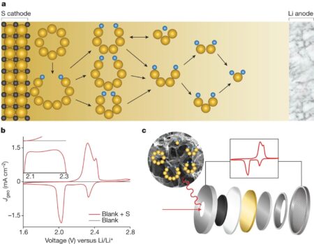 Polysulfide conversion reactions involved in the Li-S battery. a, Schematic illustration of the SRR network involved in the Li-S battery. Blue and yellow spheres represent lithium…