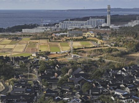 This aerial photo shows Shika nuclear power plant, rear, in Shika, on the western coast of the quake-struck Noto peninsula, Ishikawa prefecture, Japan, on Jan. 28,…