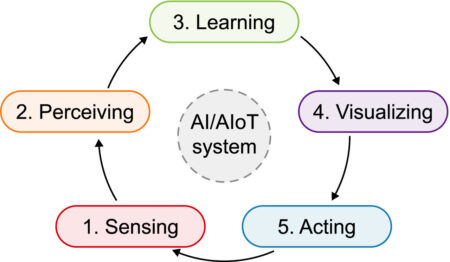 The five pillars of an AI/AIoT-driven system: 1-sensing in charge of collecting raw data, 2-perceiving in charge of extracting semantically meaningful information from raw data, 3-learning…