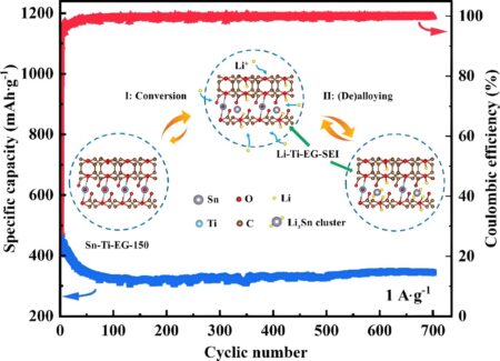 The Sn-Ti-EG anode maintained a capacity of 345 mAh g-1 (blue line) at a current density of 1.0 A g-1 after 700 charge-discharge cycles. The metal-organic…