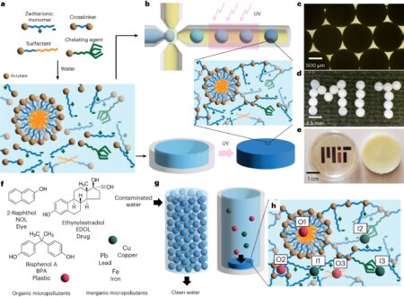 Synthesis and use of zwitterionic hydrogel absorbents. a, The synthesis of zwitterionic hydrogels begins with the dissolution of zwitterionic monomers, crosslinkers, surfactants and chelating agents, to…