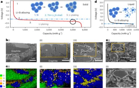 Significant Li plating capacity from Si anode. a, Li discharge profile in a battery of Li/graphite–Li5.5PS4.5Cl1.5 (LPSCl1.5)–LGPS–LPSCl1.5–SiG at current density 0.2 mA cm–2 at room temperature. Note that…