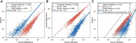 EVSE and gasoline stations scaling applied to different populations. a) EVSE and gas stations scale sub-linearly, following economies of scale, with their respective vehicle registrations per…
