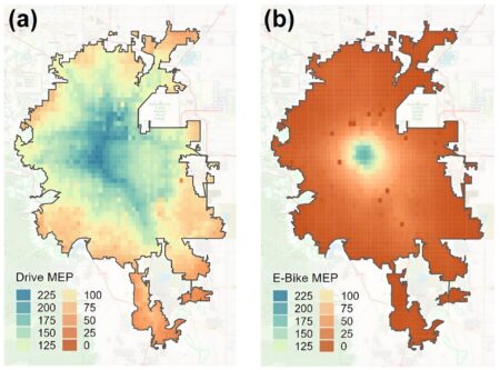 MEP scores for Denver are mapped for (a) drive and (b) e-bike modes. Each pixel is 1 km2. The highest e-bike MEP score across all locations was…