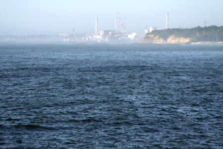 The Fukushima Daiichi nuclear power plant, damaged by a massive March 11, 2011, earthquake and tsunami, is seen from the nearby Ukedo fishing port in Namie…