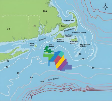 by Erin L. Meyer-Gutbrod, Douglas Nowacek, Eileen E. Hofmann and Josh Kohut, The Conversation Map of the Nantucket Shoals region, showing current wind-power lease areas (colored…