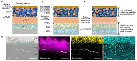 a–c, Illustrations of the in situ formation of F@NMC811/Li6PS5Cl/LiMgSx/Li3Bi/LiMg. d, Cross-sectional scanning electron micrographs and EDS images of the Li3Bi/Li interface (converted from the Mg16Bi84/Li interface)…