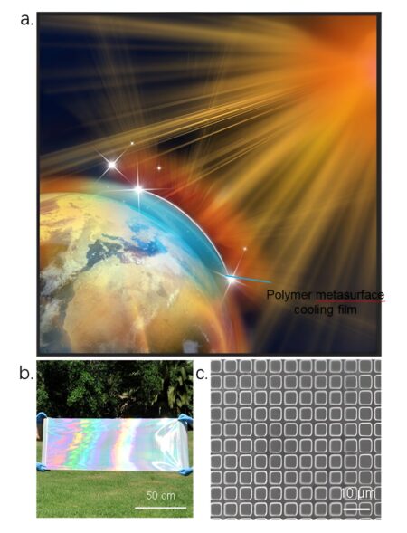 Concept and demonstration of polymer metasurface radiative cooling film. a. Conceptual image of the large-scale polymer metasurface cooling down the Earth under sunlight. b. A photo…