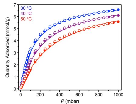 1,1-Difluoroethylene adsorption isotherm of activated Co2(dobdc) at 30 ºC, 40 ºC, and 50 ºC. Solid lines represent fits to the dual-site Langmuir model and open circles…