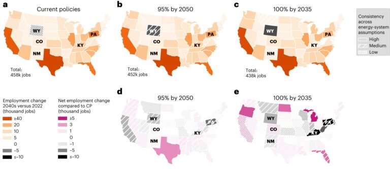 Modeled employment change and net employment change under the mid-case emission-reduction scenarios in the 2040s. Employment change (equation (7)) describes the difference of the workforce in the decade before mid-century compared to today while accounting for natural retirement. A value of 1 indicates that 1,000 new entrants would be required to deliver the transition. A value of −5 indicates that 5,000 current workers may lose their jobs in addition to natural retirement. Net employment change (equation (8)) is the employment change of an emission-reduction trajectory compared to that of the current policies trajectory. A value of 1 means that said emission trajectory creates 1,000 more jobs than current policies in the 2040s. a–c,The top row of maps shows the employment change under current policies (a), 95% reduction by 2050 (b) and 100% reduction by 2035 (c). States colored orange see employment growth, whereas gray states see employment decline. d–e, The bottom row of maps shows the net employment change under 95% reduction by 2050 (d) and 100% reduction by 2035 (e) compared to current policies. States colored pink see more employment under decarbonization than CP, whereas gray states see less. Hatching denotes the level of consistency across energy-system assumptions within each group. High consistency means all energy-system assumptions have the same sign of change as the mid-case. Medium and low consistencies represent more than and less than 80% of the 14 energy-system assumptions sharing the same sign as the mid-case, respectively. The base maps are from the US Census Bureau85. CP, current policies. Credit: Nature Climate Change (2023). DOI: 10.1038/s41558-023-01802-5