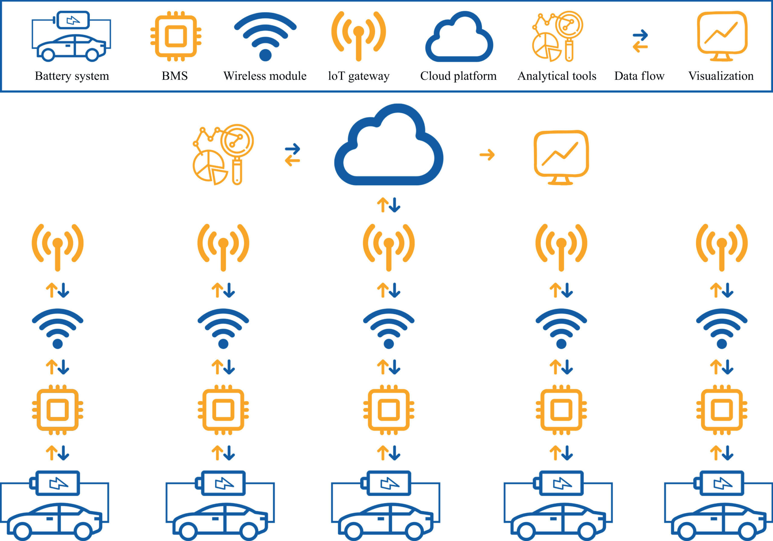 The IoB comprises three main components: battery systems, IoT gateway, and cloud platform, and two additional components, i.e., BMS and wireless module, which are integrated inside the battery systems.