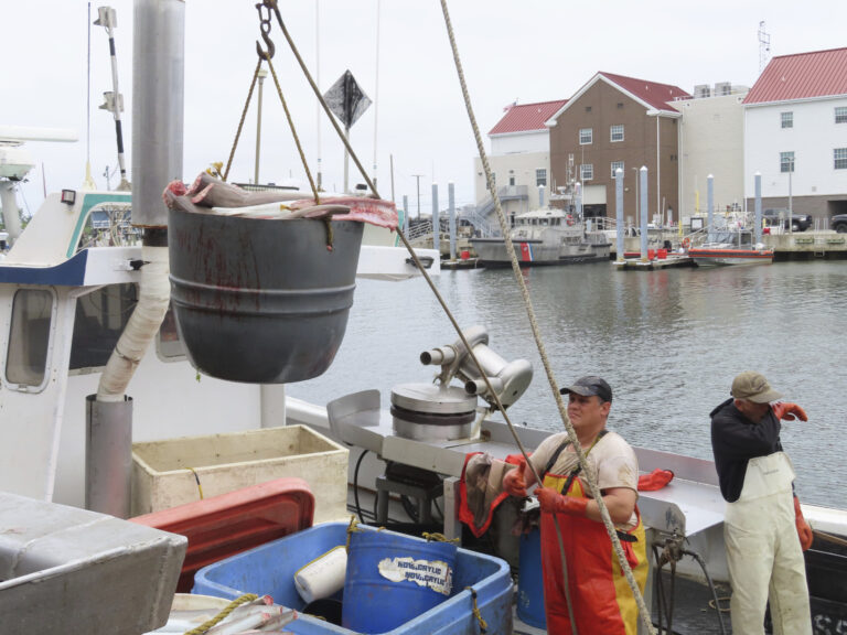 Workers at the Fishermen’s Dock Co-Operative dump barrels of fish onto a metal tray in Point Pleasant Beach, N.J., on June 20, 2023. The commercial and recreational fishing industry has numerous concerns over offshore wind projects. The wind industry says it has tried to address those concerns, and will pay compensation for those that can’t be avoided. Credit: AP Photo/Wayne Parry
