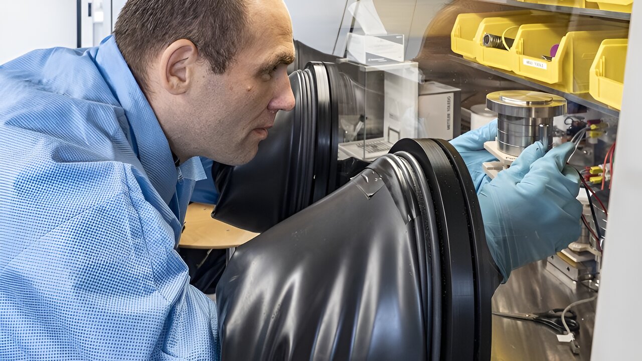 Under pressure: Kostiantyn Kravchyk studies whether the unwanted growth of dendrites can be reduced with pressure. The work on the novel batteries is carried out in a protective atmosphere. Credit: Empa