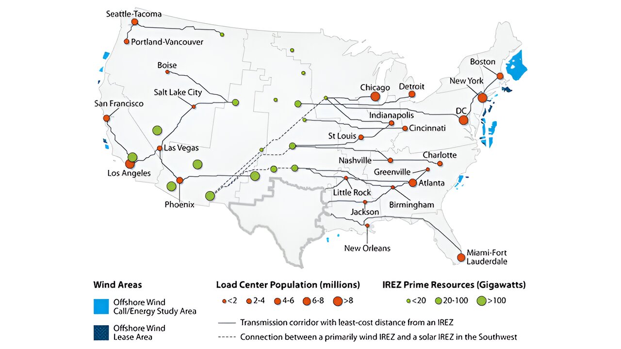 Each zone contains an IREZ hub, where transmission substations collect power from various renewable energy plants and connect them to bulk power systems. Power from an IREZ is sent along high-voltage direct current transmission paths across state lines to major load centers (pictured in red above).