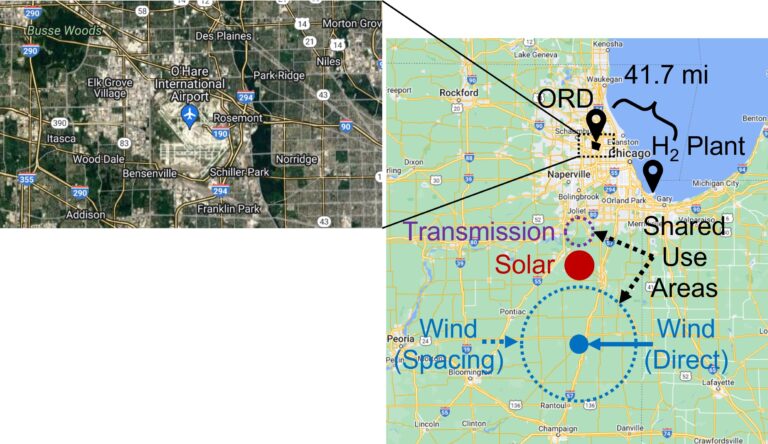 Without naming specific locations in Chicagoland, Ansell approximated the amount of physical land that would be needed to produce renewable electric energy to produce useable hydrogen for aviation. These might be a combination of solar arrays or wind turbines. He also investigated repurposing outdated energy-producing facilities.