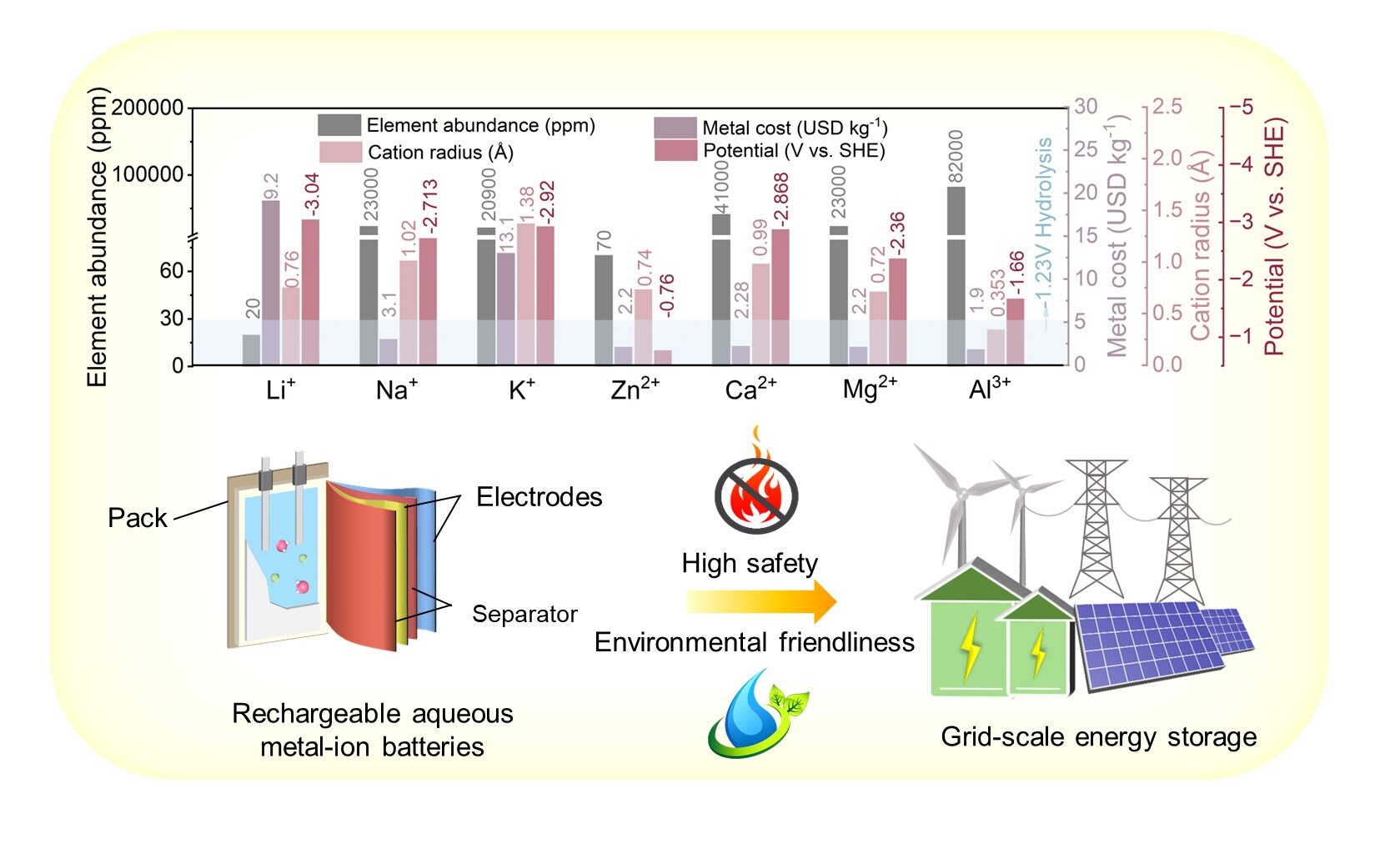 Rechargeable aqueous metal-ion batteries (AMBs) have attracted extensive scientific and commercial interest due to their potential for cost-effective, highly safe, and scalable stationary energy storage. However, their limited output voltage, inadequate energy density, and poor reversibility of ambiguous electrode reactions in aqueous electrolytes strongly limits their practical viability.