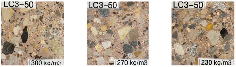 Three LC3-based concretes with varying amounts of cement. As the cement content in the concrete mix decreases, the compressive strength increases. Credit: Franco Zunino