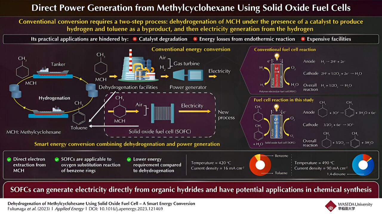 Recently, a team of researchers from Japan, led by Professor Akihiko Fukunaga from the Department of Applied Chemistry at Waseda University, has succeeded in generating electricity directly from MCH using solid oxide fuel cells (SOFC). Their work is published in Applied Energy.
