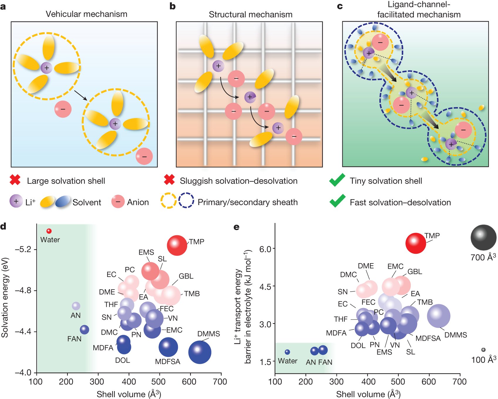 Electrolyte design and solvent-screening strategies. a–c, Schematic illustrations of Li+ transport behaviors with the vehicular mechanism (a), structural mechanism (b) and ligand-channel-facilitated mechanism (c). d, The solvation energy and solvation-shell volume of solvents. e, The Li+ transport energy barrier and solvation-shell volume of solvents. The electrolyte using the solvents with small size, low solvation energy and Li+ transport energy barrier can conduct Li+ through the ligand-channel transport mechanism. Credit: Nature (2024). DOI: 10.1038/s41586-024-07045-4