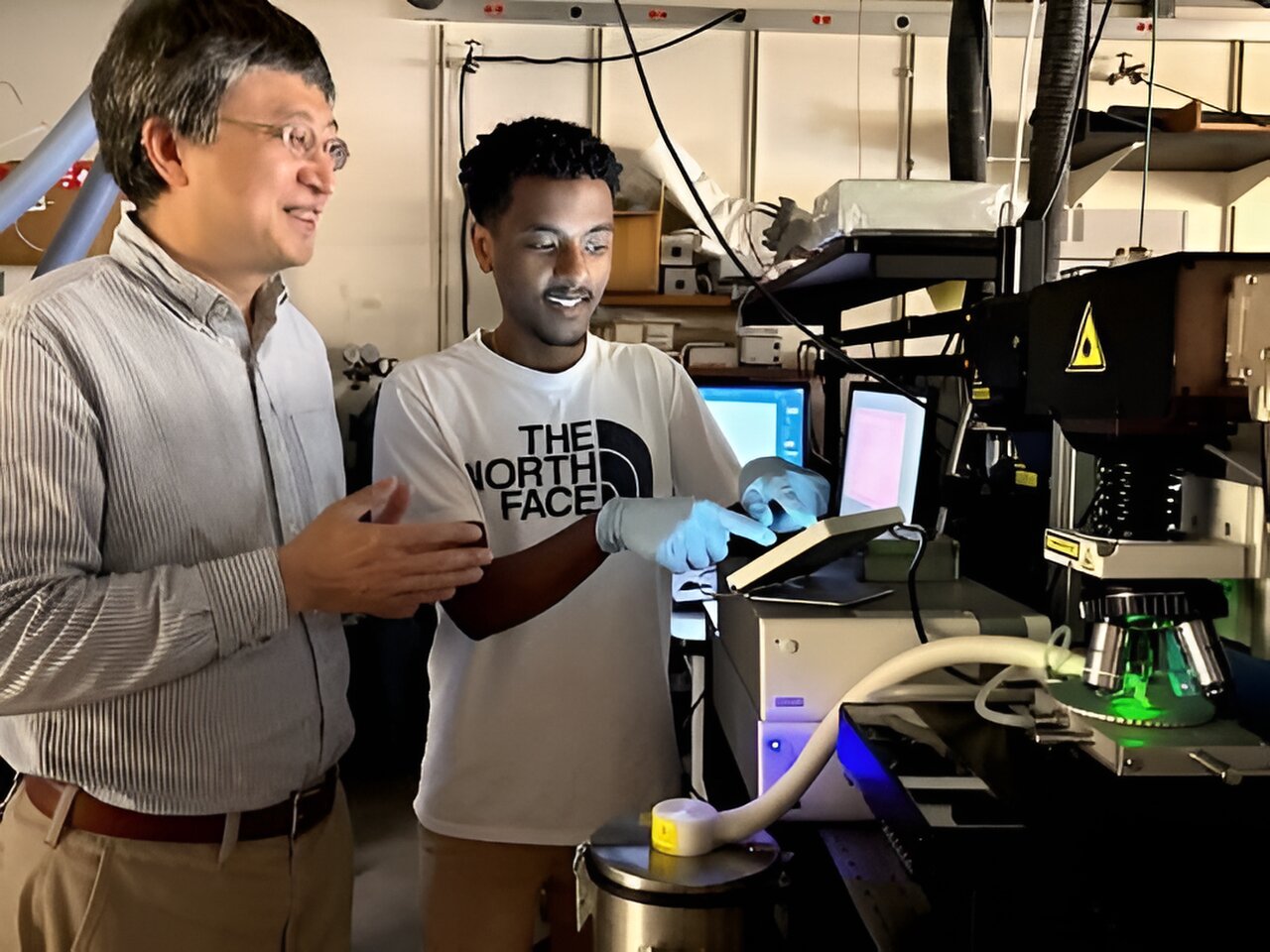 Professor Jifeng Liu and engineering PhD candidate Gideon Kassa conducted experimental follow-up testing to confirm the properties and potential of Zintl-phosphide BaCd2P2. Credit: Catha Mayor