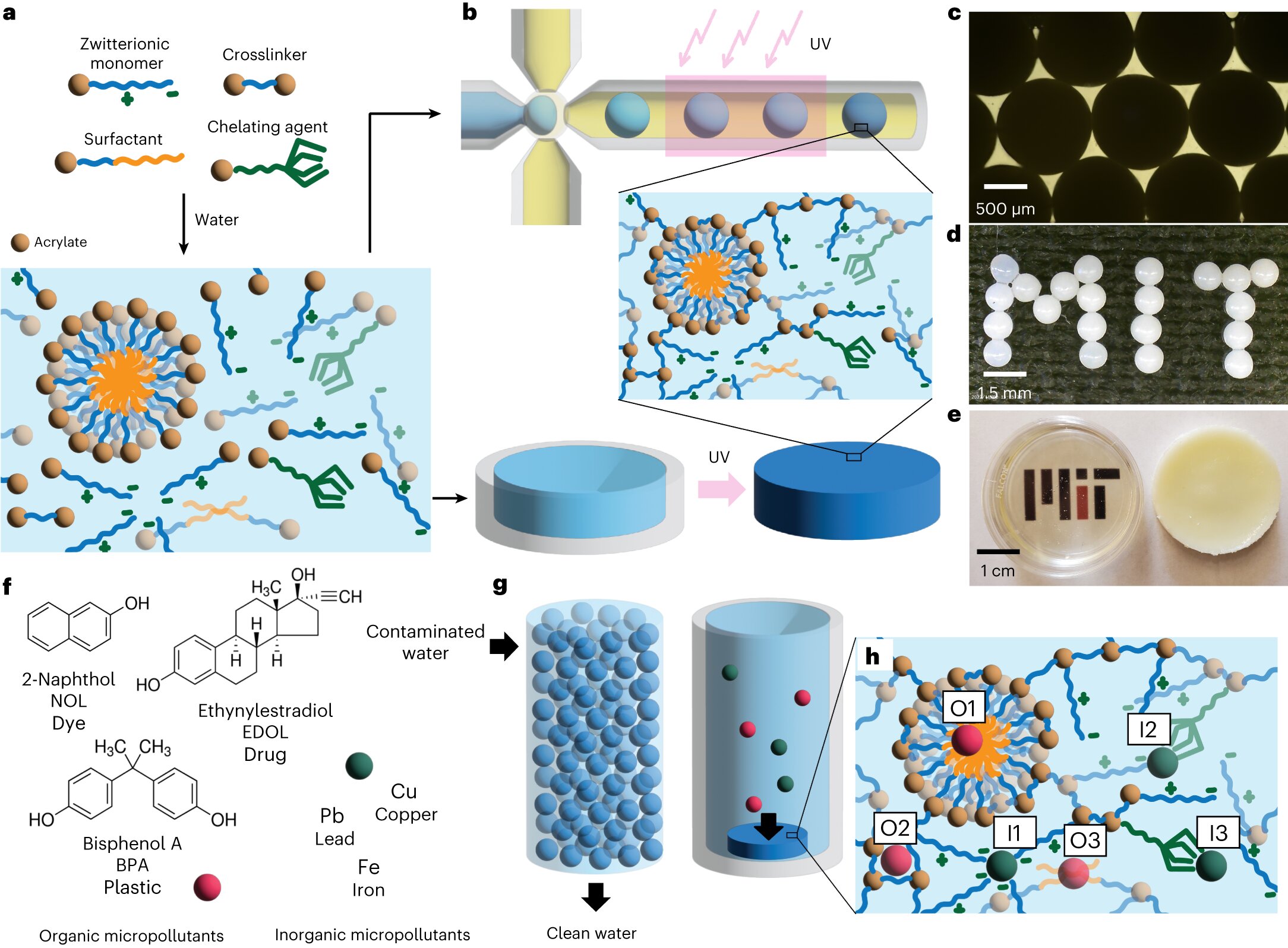 Synthesis and use of zwitterionic hydrogel absorbents. a, The synthesis of zwitterionic hydrogels begins with the dissolution of zwitterionic monomers, crosslinkers, surfactants and chelating agents, to which acrylate groups are attached (Supplementary Fig. 1), in the presence of a photoinitiator. The surfactants self-assemble into micelles on dissolution. b, The monomer solution is used to prepare monodisperse droplets using an off-the-shelf microfluidic device or is poured into a mold. Exposure to UV light converts the liquid solution into solid hydrogels through a chain-growth polymerization reaction. c, The microparticles produced using the microfluidic device are highly monodisperse. d, Hydrogel microparticles arranged on a flat surface to read ‘MIT’. e, The monomer solution before (left) and after (right) polymerization to prepare a hydrogel tablet. The change in opacity is indicative of the presence of micelles in the polymerized hydrogel, which is further discussed in Supplementary Fig. 3. f, The organic and inorganic micropollutants studied in this work. g, The hydrogels can be incorporated into various unit operations, such as microparticles in a packed bed or tablets to clean water in a glass. h, The multifunctional zwitterionic hydrogels contain multiple types of site to which micropollutants can bind. Organic micropollutants can bind to the hydrophobic micelle cores (O1), hydrogel backbone (O2) or hydrophobic segments of free surfactant molecules (O3), while inorganic micropollutants can bind to the zwitterionic monomers (I1), both the zwitterionic monomers and chelating agents (I2), or chelating agents (I3). Credit: Nature Water (2024). DOI: 10.1038/s44221-023-00180-8