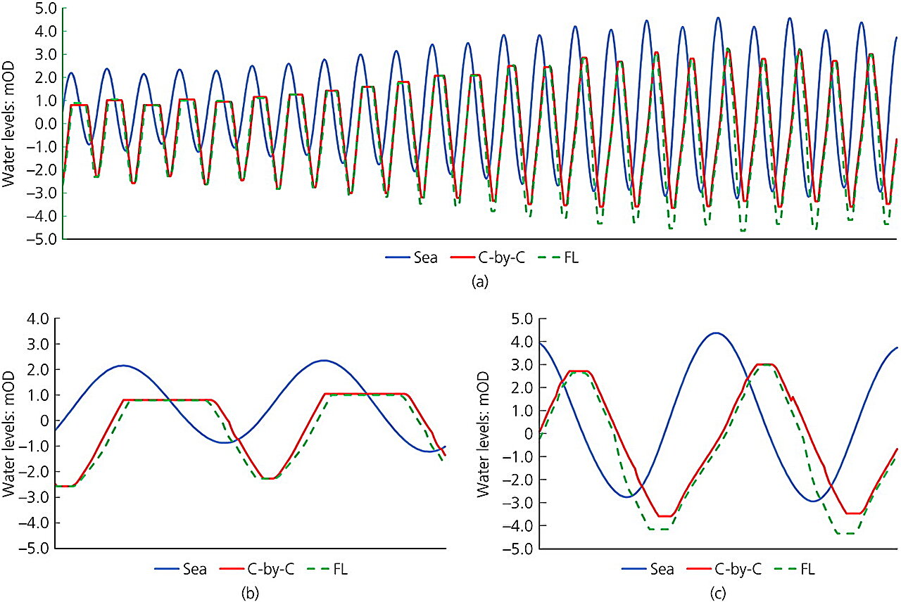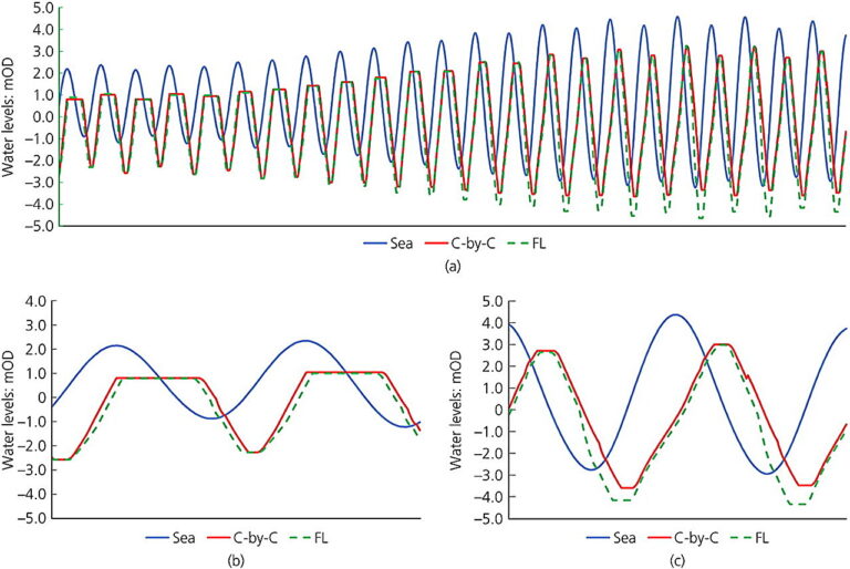 The sea and impoundment levels for the base case installation with 1.2 m of SLR. The truncated tops of the scenario curves show that pre-SLR high tide limits are easily achieved by simply closing sluices and stopping generation or pumping when the existing high tide level is attained. Pumping is necessary to achieve the pre-SLR low tide levels. At neap tides, there is little or no difference between the efficient C-by-C operating mode and the FL mode, which means there is no cost to achieve existing low tide levels. At spring tides, the FL mode starts ebb generation slightly earlier than the C-by-C mode and the rate of discharge and turbine speed is slightly greater. The amount of pumping required at low tide is similar, but the FL mode starts earlier. The FL mode achieves the required current MLWS levels with an additional reduction of 1% of the AEP. Spring low tide inside the impoundment lags the natural tide by 2 h 36 min for C-by-C and 2 h 0 min for FL modes. Credit: Proceedings of the Institution of Civil Engineers – Energy (2023). DOI: 10.1680/jener.23.00031