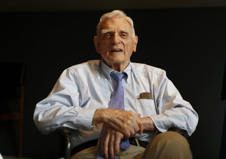 2019 Nobel Laureate in chemistry John B. Goodenough looks on after signing a chair as part of the traditional Nobel Chair Signing ceremony at the Nobel Museum in Stockholm, Sweden, Friday Dec. 6, 2019. Goodenough, who shared the 2019 Nobel Prize in chemistry for his work helping develop the lithium-ion battery, transforming technology with rechargeable power for devices ranging from cellphones, computers, and pacemakers to electric cars, died Sunday, June 25, 2023,, the University of Texas announced Monday, June 26. He was 100. Goodenough was a faculty member at Texas for nearly 40 years. Credit: Henrik Montgomery/TT via AP, File